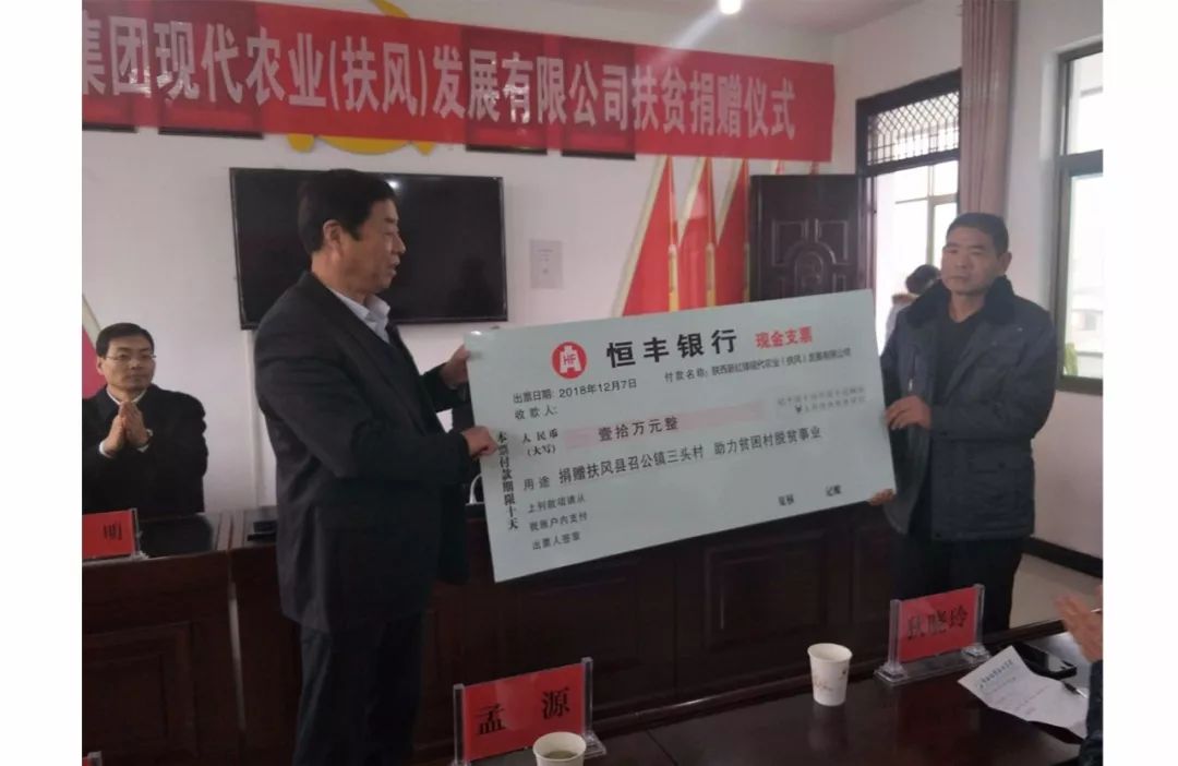 12月7日,紅鋒集團(tuán)旗下現(xiàn)代農(nóng)業(yè)公司為扶風(fēng)縣召公鎮(zhèn)三頭村捐資十萬(wàn)元,助力村委會(huì)基礎(chǔ)設(shè)施和環(huán)境建設(shè),推進(jìn)貧困村脫貧工作進(jìn)程。