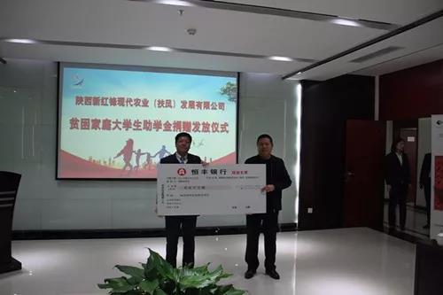 2018年3月10日上午,陜西新紅鋒投資集團(tuán)旗下新紅鋒現(xiàn)代農(nóng)業(yè)(扶風(fēng))發(fā)展有限公司貧困大學(xué)生助學(xué)金捐贈(zèng)暨發(fā)放儀式在新紅鋒大廈順利舉行。新紅鋒集團(tuán)黨委書記、總裁周鋒,副總裁張紅梅,總經(jīng)理李文武,黨委副書記葉清海,總裁助理聶陽(yáng)慧,寶雞市委常委、扶風(fēng)縣委書記周宇松,扶風(fēng)縣政府副縣長(zhǎng)郭小軍,美國(guó)羅文大學(xué)生化教授、日本21世紀(jì)醫(yī)學(xué)研究會(huì)顧問醫(yī)師牟曉陽(yáng),扶風(fēng)縣教體局局長(zhǎng)許存君,副局長(zhǎng)張軍及獲得助學(xué)金的10名優(yōu)秀貧困大學(xué)生和扶風(fēng)縣教體局、陜西新紅鋒現(xiàn)代農(nóng)業(yè)(扶風(fēng))發(fā)展有限公司的工作人員參加本次捐助儀式。儀式由陜西新紅鋒投資集團(tuán)總經(jīng)理、陜西新紅鋒現(xiàn)代農(nóng)業(yè)(扶風(fēng))發(fā)展有限公司董事長(zhǎng)李文武主持。