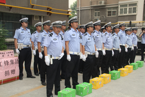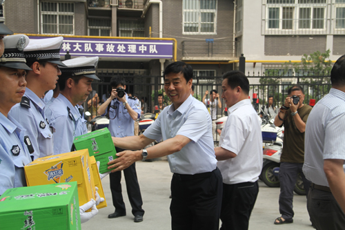 2015年7月9日上午,在碑林區(qū)人大主任左長民、副主任吳耀、袁新中、史亞鴿、張立華等領(lǐng)導(dǎo)的帶領(lǐng)下,集團黨委書記葉清海、總裁助理王彥濤來到碑林區(qū)交警大隊,親切慰問奮戰(zhàn)在一線的的民警同志,向民警們送來了飲料、藿香正氣水、花露水等消暑降溫品及毛巾等物品。